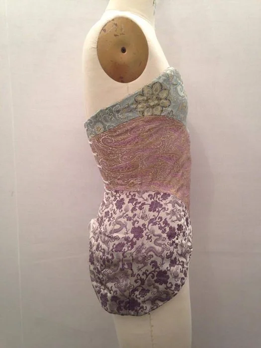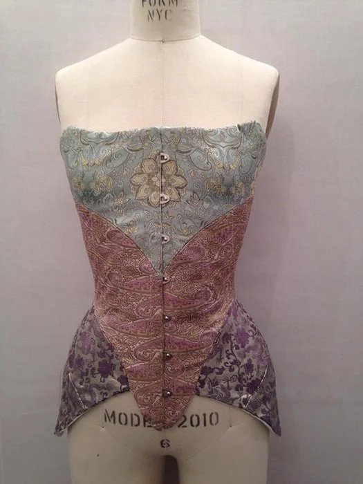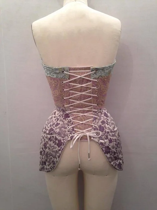 Corsets are fitted incredibly precisely to the wearer. This wearer had scoliosis, so you will see in these images that there is a minor difference in the patterning on the left and right sides of the corset to accommodate the difference in curvature of the wearer’s body from left to right. When worn, this creates the illusion of a perfect waist line and makes it a comfortable garment. Care was taken to match the pattern on the fabric so that the flower motif flows uninterrupted across the front busk seam. The corset is made of coutil and silk brocade, with spiral steel and flat steel boning encased in cotton and flannel.